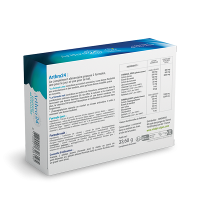 Notre complément alimentaire Arthro’24 associe 2 formules bénéfiques pour votre santé articulaire. La Formule Jour pour aider à favoriser le bien-être articulaire et votre mobilité́. La Formule Nuit pour renforcer vos articulations et les déverrouiller au réveil.